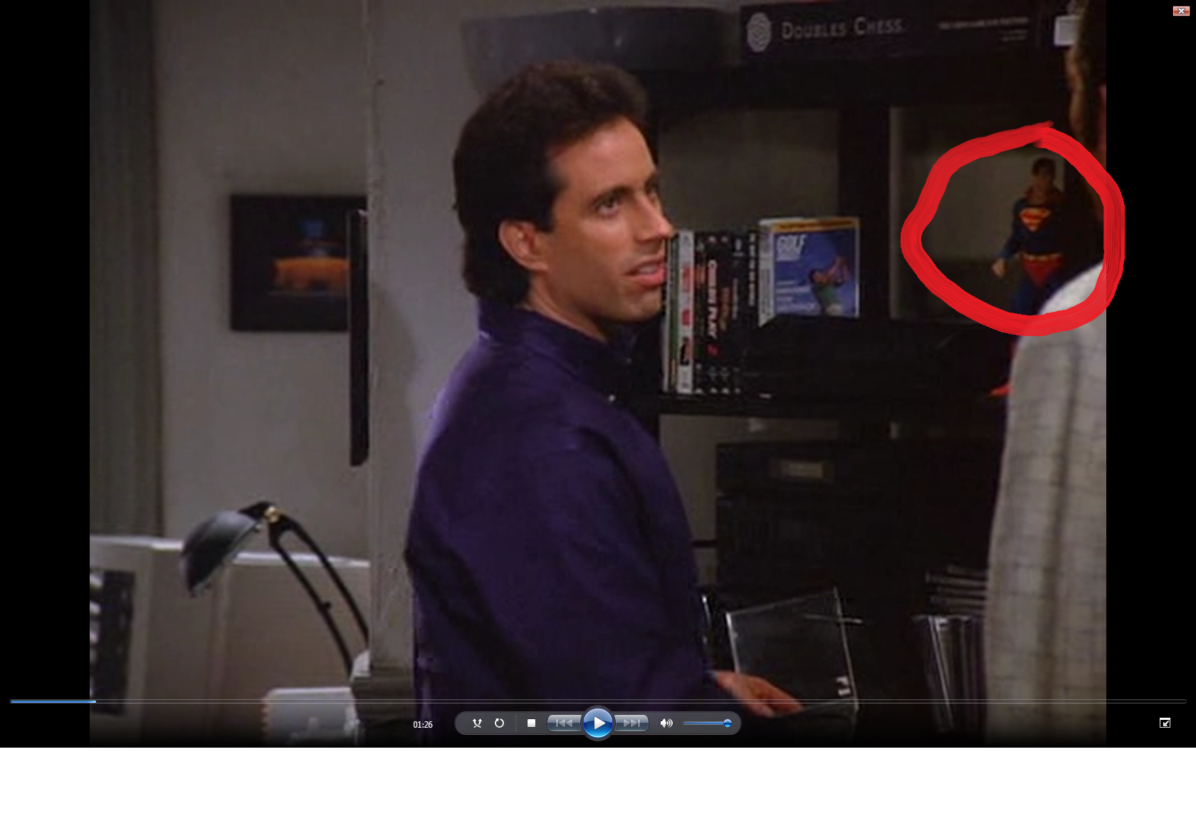 seinfeld 2There he is, the Man of Steel. Guarding Jerry’s precious copy of “Child’s Play 3”. If you can see or hear about Superman in every episode of Seinfeld, this little action figure must account for over half of them. I also know that he sometimes has a Superman magnet on his refrigerator.